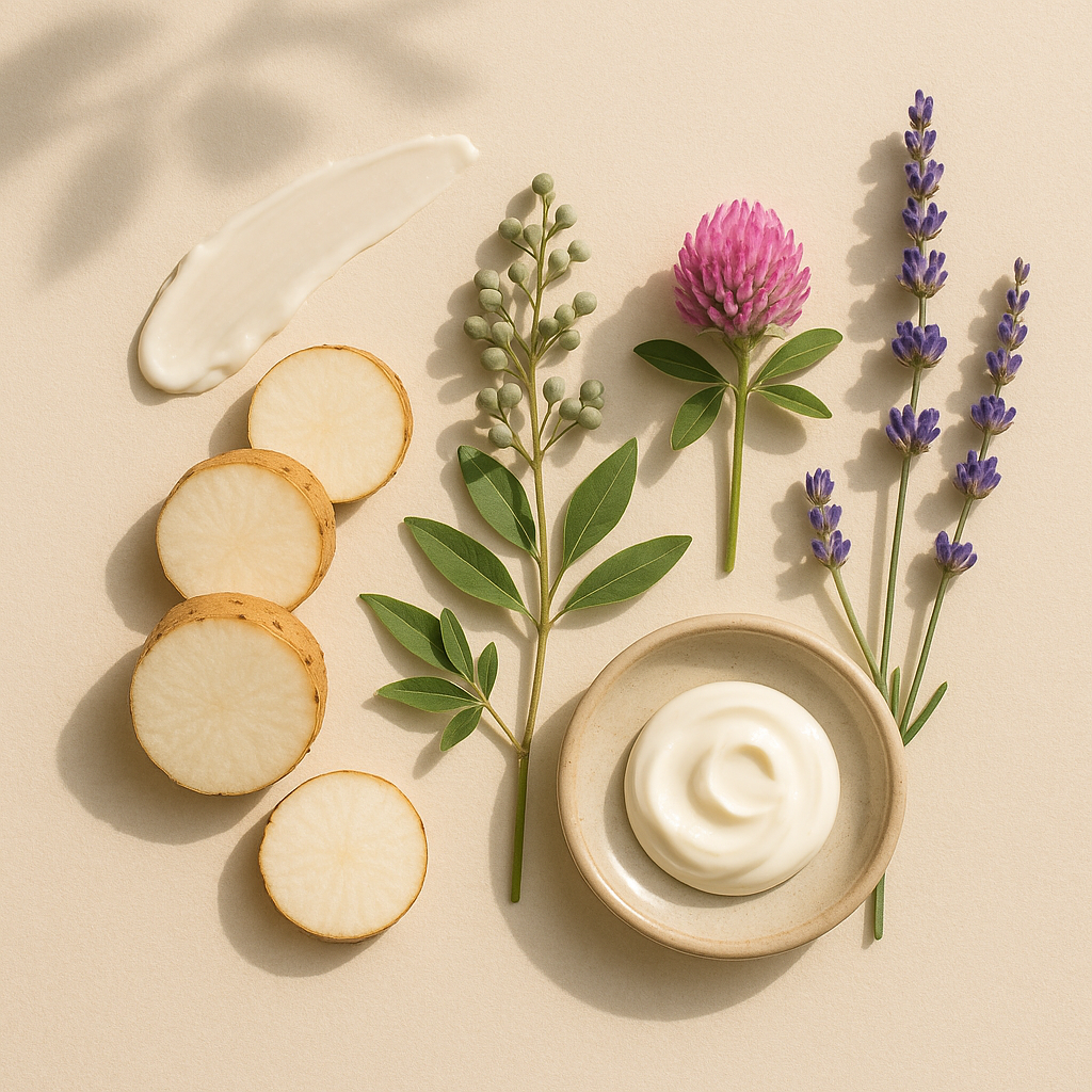 Balance Bloom is a hormone-supportive body cream made with wild yam, chaste tree berry, red clover, and calming botanicals to support hormonal balance, mood, skin, and cycle rhythm.